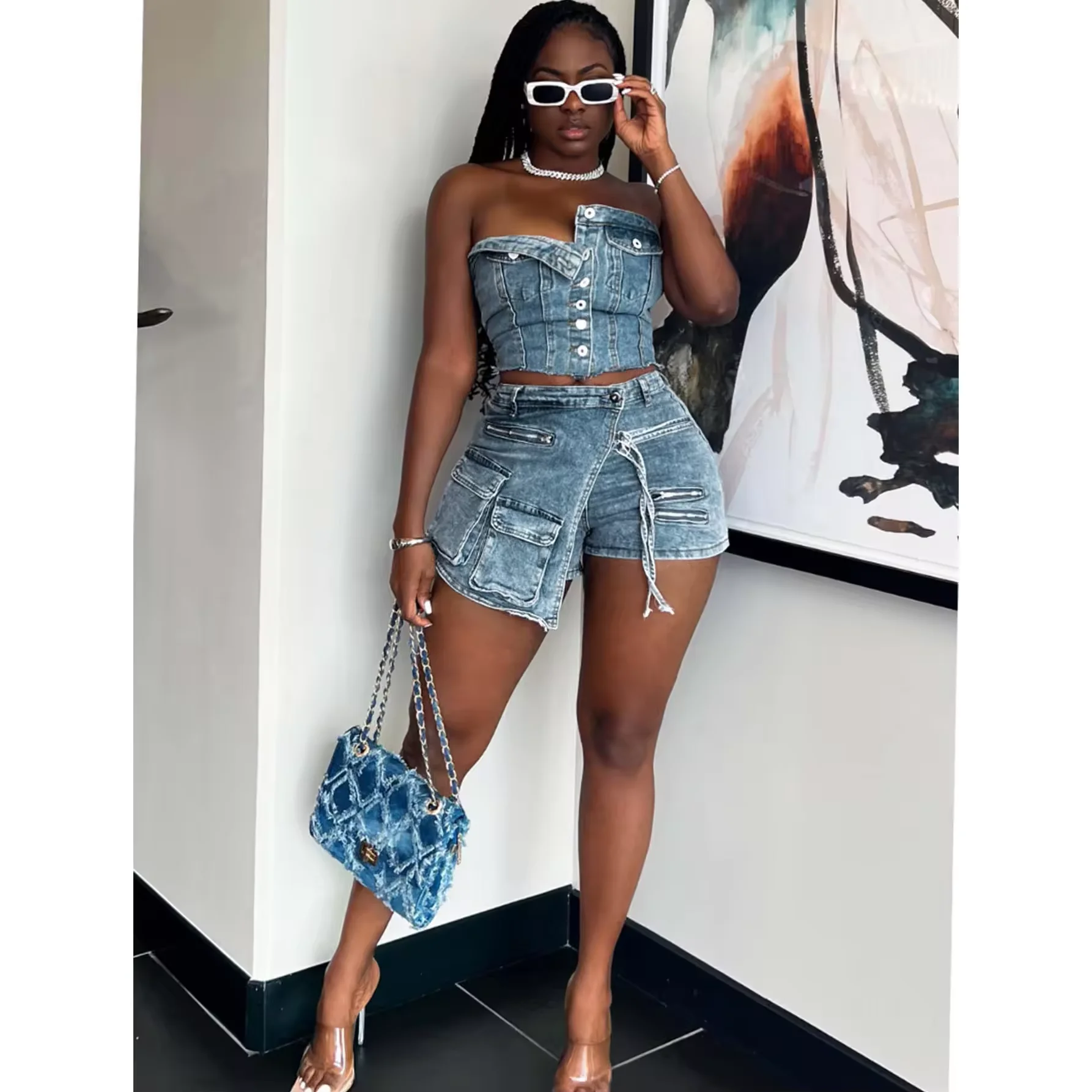 OEM Manufacturer Wholesale Summer Women's High Waist Vintage Denim Jean Top & Skirt 2-Piece Set 100% Cotton Button